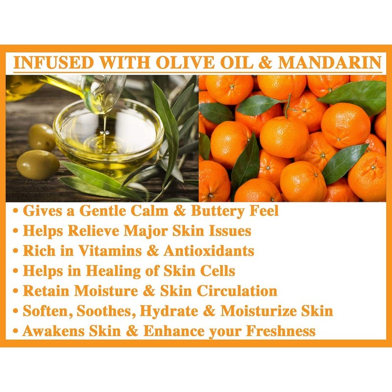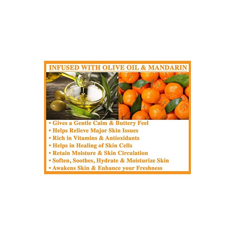 - INFUSED WITH OLIVE OIL & MANDARIN: Olive oil is known to be a perfect skin Moisturizer and gives a very clean and buttery feel. It gives a very gentle and clean feel to skin and help in relieving Eczema and Psoriasis and Acne. Mandarin on the other hand is infused with Vitamin C and helps with healing of skin cells, retain moisture and increase skin circulation.