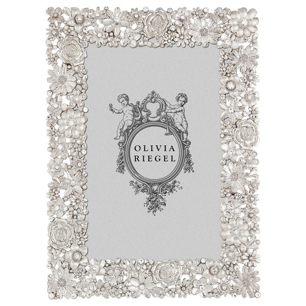 picture frames / photo frames: Silver finished pewter garden floral pattern adorned with hand-set clear European crystals. Elegant gray hued moireacute; silk back with easel designed for vertical or horizontal placement. Tarnish resistant. Signature luxury gift box included. An original design frame from the Olivia Riegel(r) collection 851090000636 - RT4516