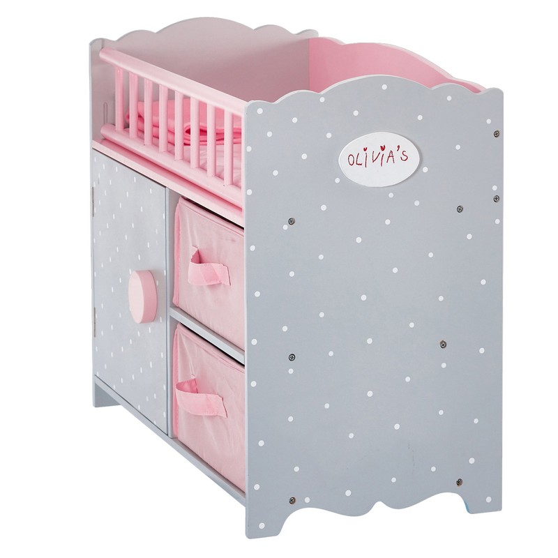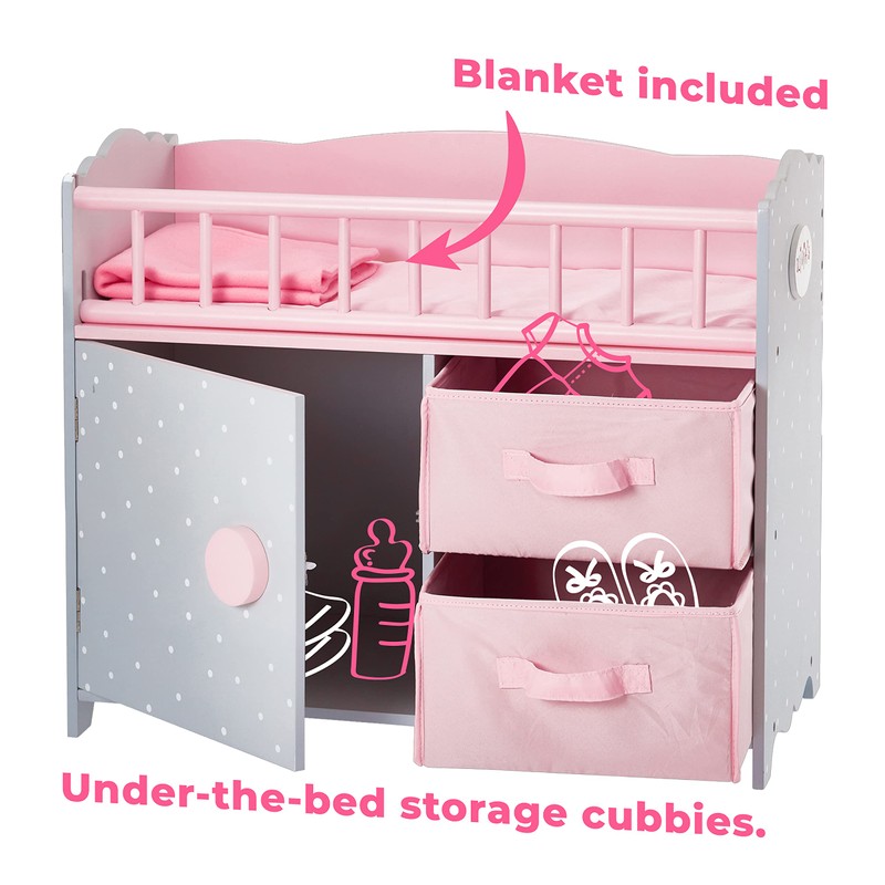 Olivia's Little World Wooden Baby Doll Crib with a Cabinet and Two Cubbies for Doll Accessory Storage Underneath, Pink and Gray and White Polka Dots