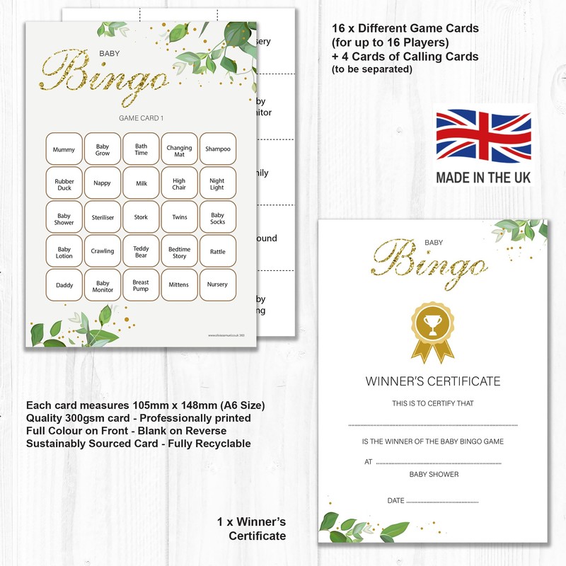 - BABY BINGO - BABY SHOWER GAME ⭐ Pretty Botanical Theme ⭐ Pack of 16 Guest Cards + 4 sheets of 15 calling cards for the host + Winner's Certificate