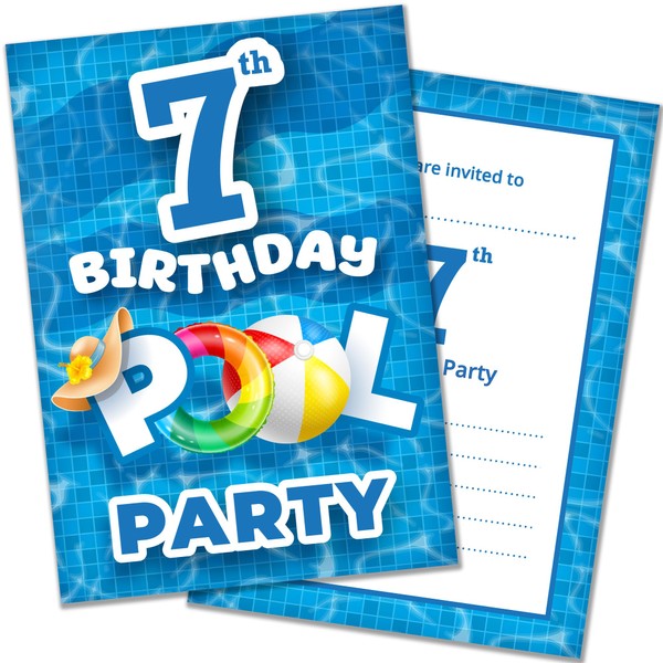 - POOL PARTY INVITES - AGE 7 ⭐ Pack of 20 high quality 7th Birthday Pool Party Birthday Invitations ⭐ A6 Size (105mm x 148mm) ⭐ Professionally printed both sides ⭐ Supplied with white envelopes