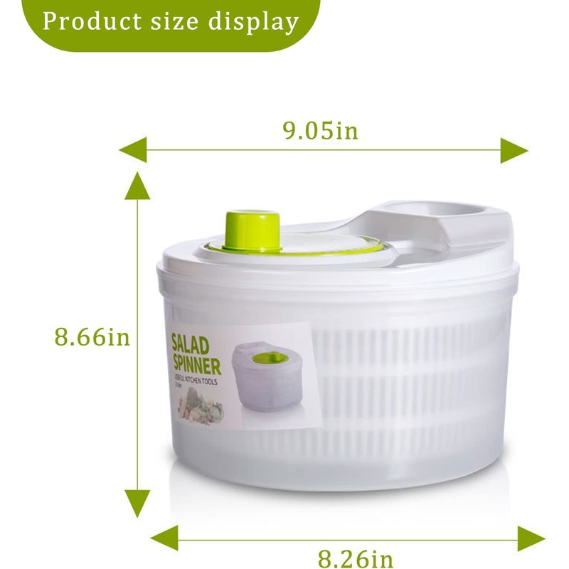 Material: PP Capacity: 3L Color: White+GreenOperation method: Open the lid, put the washed vegetables into the sieve basket, and close the lid.Hold the dryer with one hand and turn the handle with the other to spin dry. Open the lid and take out the inner barrel. You can see that the moisture on the food has dried out. Dump the water from the outer bucket.Packing List: 1*Vegetable Salad Spinner