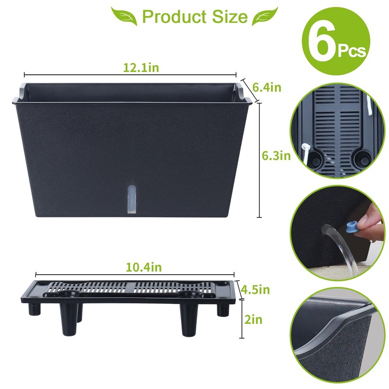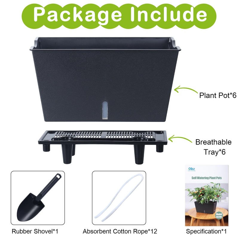 Oliz Window Box Planter 6 Pcs, 12.1 Inches Self Watering Plant Pots Rectangle Flower Pots with Drainage Holes and Breathable Trays, Vegetable Planters for Windowsill Patio Garden Balcony Porch Yard (Black)