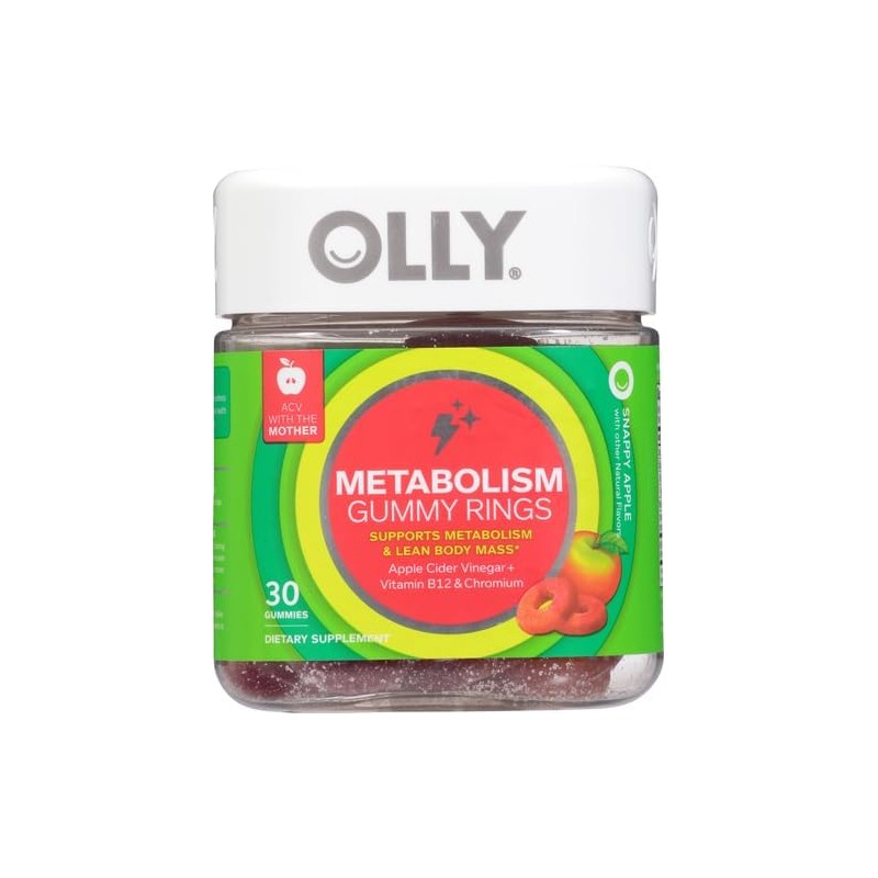 OLLY Metabolism Gummy Rings are packed with goodness to enhance carb and lipid metabolism, promote steady energy, digestive health, and power production.* They’re expertly blended with Chromium—a clinically studied dose that supports lean body mass and helps boost metabolism—Apple Cider Vinegar with the “mother” (protein strands containing gut-friendly probiotics), and Vitamin B12—the fuel your body needs to burn without burning.* Gummy Rings come in a super-delicious Snappy Apple flavor, so you can get the benefits of apple cider vinegar without having to drink it. Zero synthetic flavors or colors, and they’re gluten-free. Adults, take 1 gummy daily. Chew thoroughly before swallowing.* Good health is at the heart of everything we do. We create delicious vitamins and supplements with real benefits that help you live happily from the inside out. *These statements have not been evaluated by the U.S. Food and Drug Administration (FDA). This product is not intended to diagnose, treat, cure or prevent any disease.
