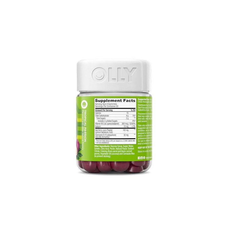 OLLY OLLY Daily Energy Gummy, Caffeine Free, Vitamin B12, CoQ10, Goji Berry, Adult Chewable Supplement, Tropical Flavor - 60 Count