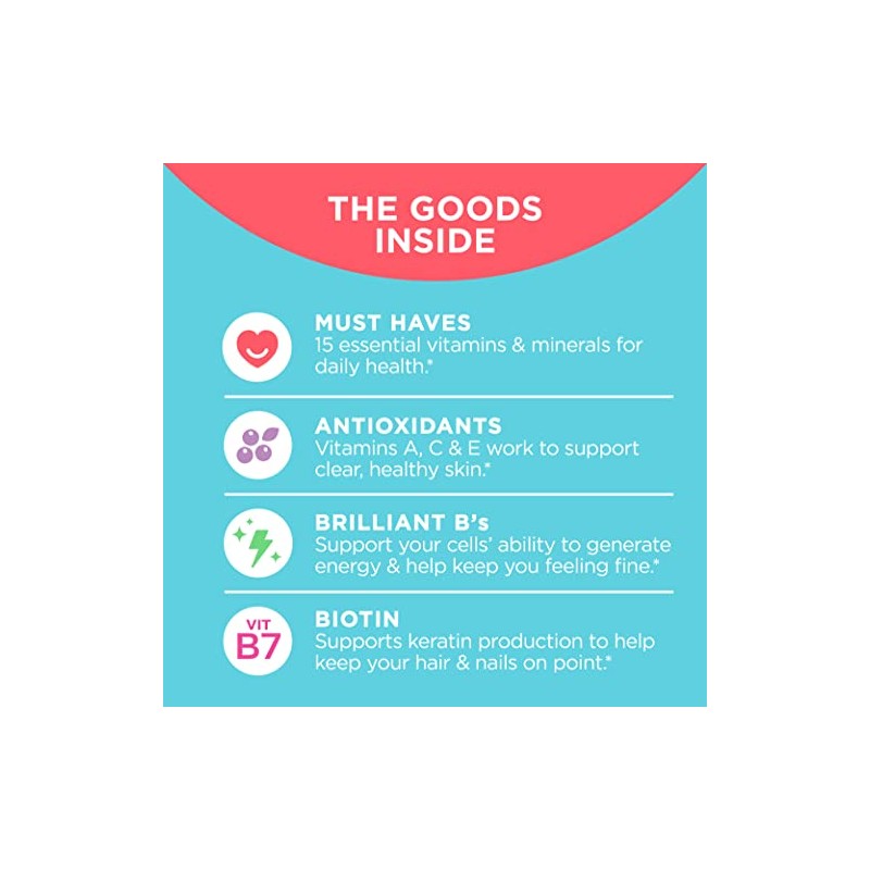 - THE GOODS INSIDE: Teen Girl Multi serves up 15 essential vitamins & minerals to nourish and energize active girls, with a boost of biotin and antioxidants to keep them shining bright*