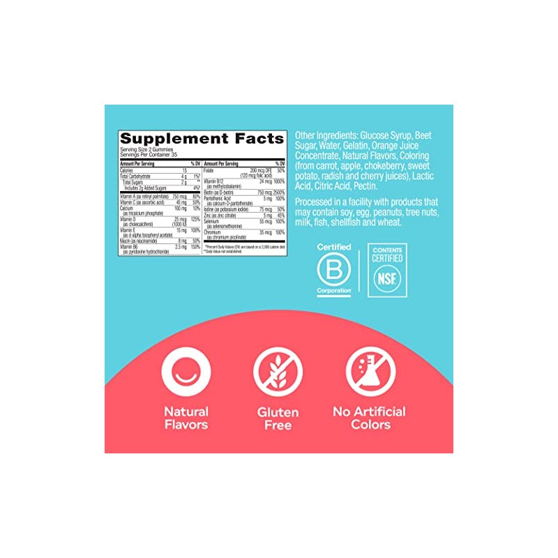 - NATURALLY DELICIOUS: A fruity combo of berries and juicy watermelon made with no artificial colors or flavors and are gluten free. 70 gummies per bottle (35 day supply)