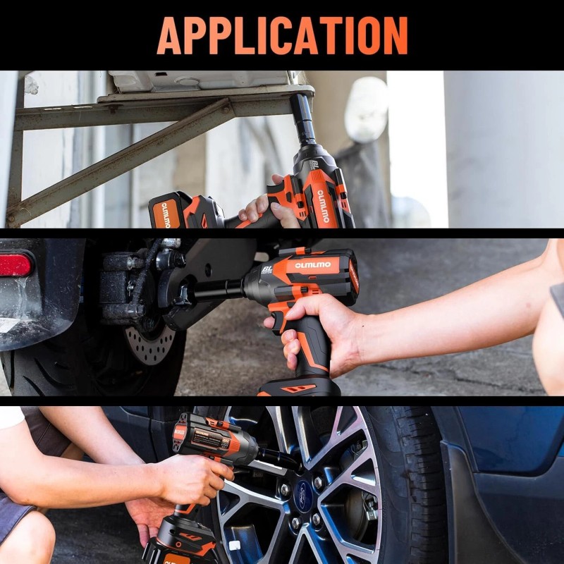 - Package List: the olmlmo Cordless Impact Wrench kit includes a 700ft-lbs(1000N.m) impact wrench, 5 sockets (17mm, 19mm, 21mm,22mm, 24mm), 2 * 4000Mah Battery, a fast charger, a tool box.