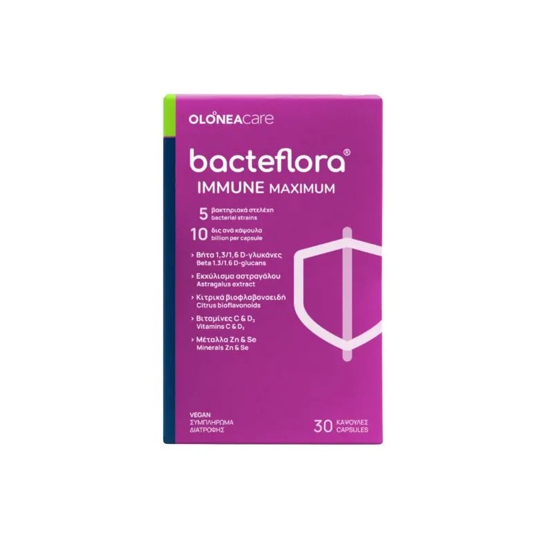 OLONEA Bacteflora Immune Maximum is a dietary supplement with 5 probiotic bacterial strains (10 billion live bacteria per capsule), vitamins, minerals, and other beneficial ingredients, all of which contribute to the strengthening of the immune system and the health of the gut.**