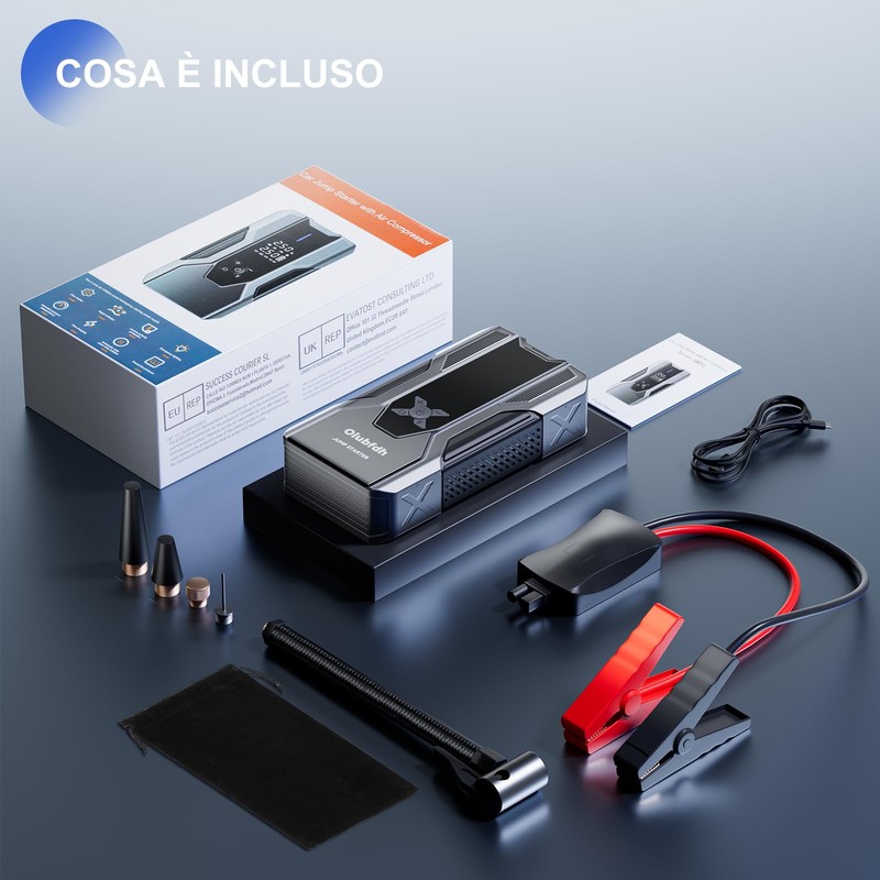 - 【Sicheres Design & Umfangreiches Zubehör】Diese Starthilfe Powerbank mit Kompressor bietet integrierten Schutz gegen Kurzschluss, Verpolung, Überhitzung und mehr. Im Lieferumfang enthalten: 1x Starthilfe Powerbank mit Display, 1x intelligentes Überbrückungskabel, 1x USB-C Ladekabel, 1x Luftschlauch, 1x Adapterdüsen Satz (für Reifen, Bälle, Luftmatratzen), 1x Tragetasche, 1x Bedienungsanleitung – alles, was Sie unterwegs brauchen.