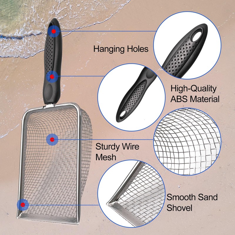 - Solid and Reliable Material: Crafted from quality metal, the sand sifters and beach scoops are sturdy and resistant to fading, breaking, or rusting. The mesh fabric shelling bag is spacious enough for your collections, ensuring longevity with proper care.(please dry the beach toy after use).