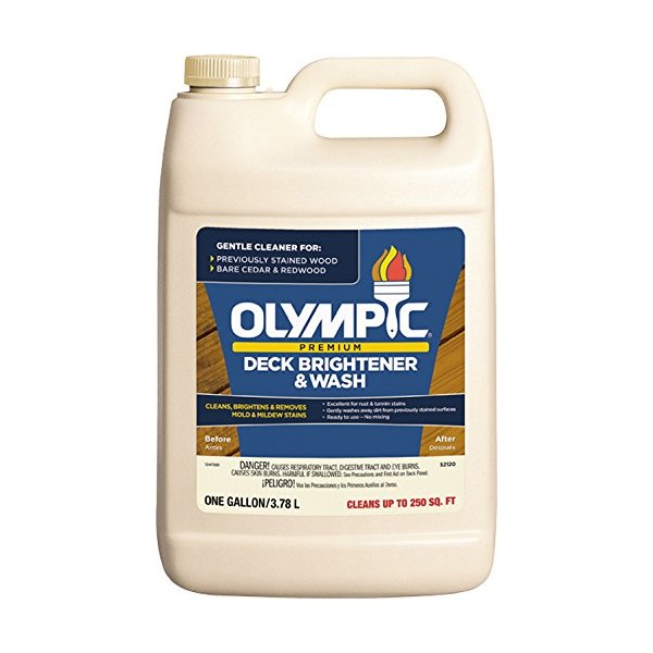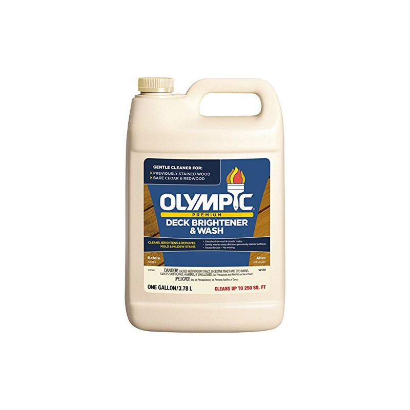 Olympic premium deck Brightener & wash cleans, brightens & removes mold and mildew stains. It can be used to clean coated and uncoated wood or composite surfaces and brighten Gray, weather wood to a refreshed appearance. It will not darken woods such as Redwood and Cedar. Olympic - trusted since 1938. Olympic - cleans decks, fences and siding.