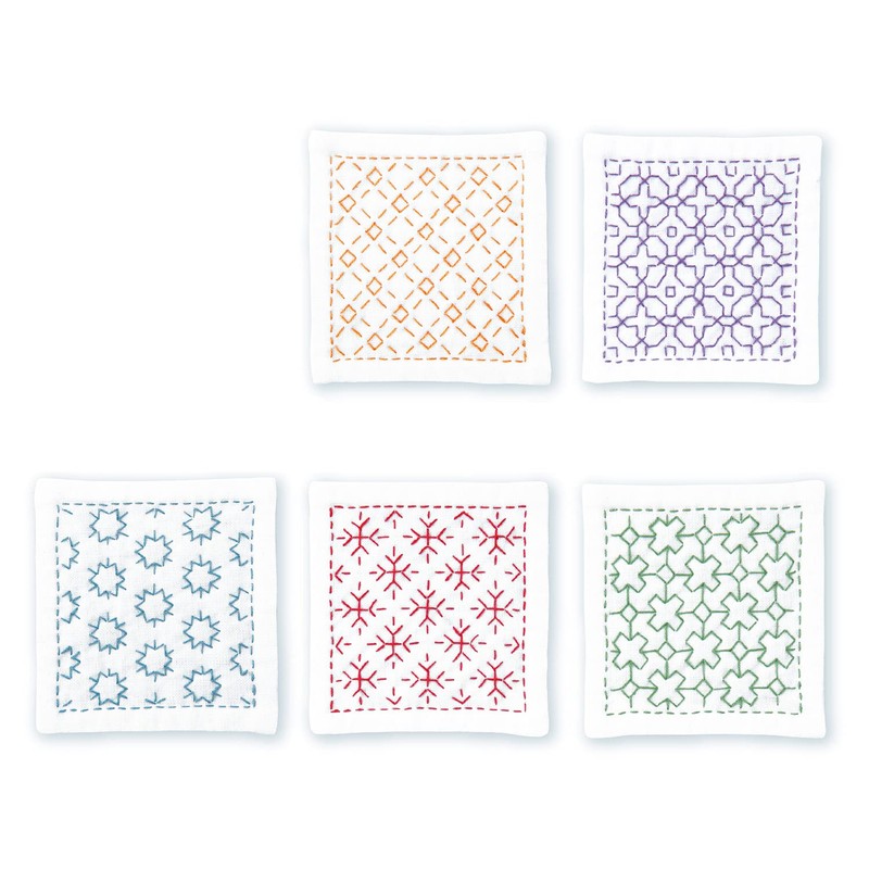 Olympus Thread Hitomezashi Sashiko Embroidery Kit Coaster White 5 Pieces Printed with Thin Sashiko Yarn Fabric