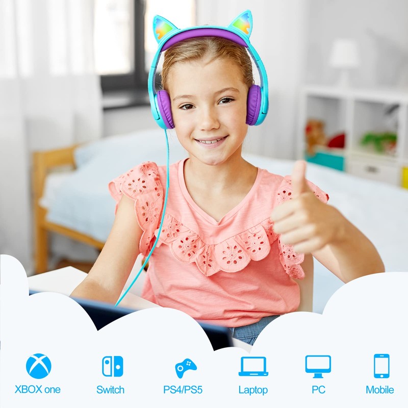 Olyre Kids Headphones, Girls Headphone Cat Ears LED Light Up Safe Volume Limi...