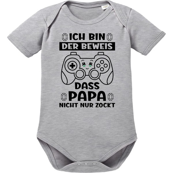 OM3® Baby Bodysuit with Saying "Ich bin der Beweis dass Papa nicht nur zockt mit Controller I - Short-Sleeved Baby Bodysuit - Organic Cotton - Girl Boy, grey mixed