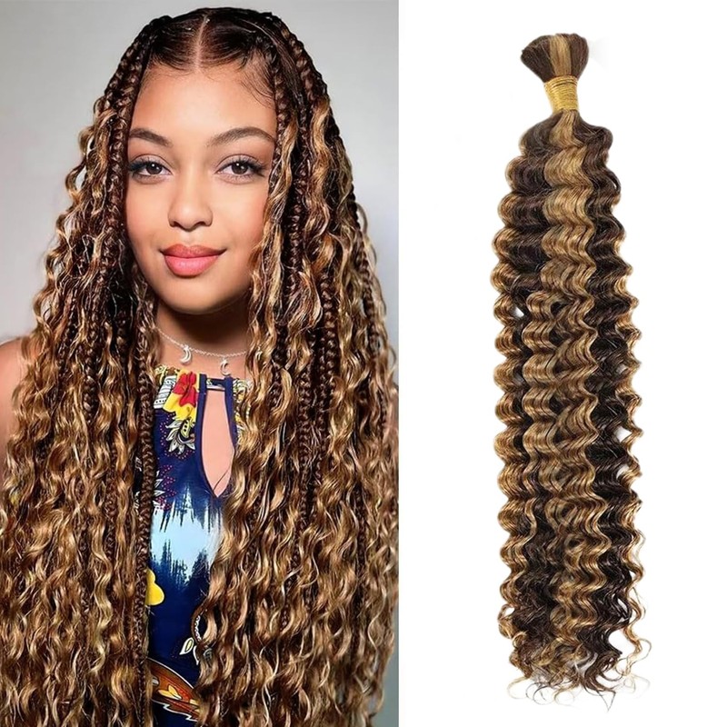 Ombre 4/27 Highlight Human Hair Braiding Hair for Boho Braids No Weft 1 Bundle Deep Wave Bulk Boho Braids Human Hair for Boho Knotless Braids Curly Bohemian Micro Braiding Hair (#4/27,26Inch,50g)