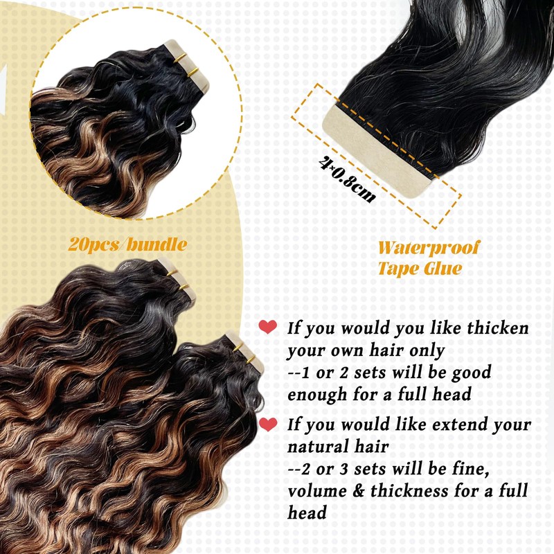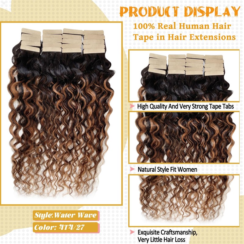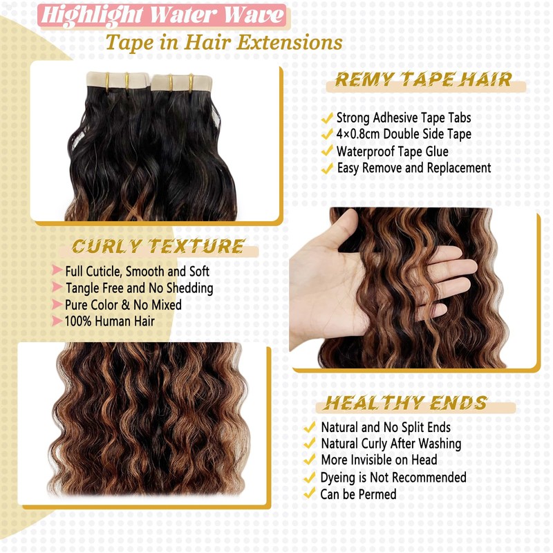 - ❤Water Wave Highlight Tape in Hair Extensions:Highlight Water Wave Hair Extensions Tape in are made of 100% real human hair, the raw materials are carefully selected and the hair is perfectly protected during the procedure,non-knotted, non-mixed with synthetic or animal hair. The remy hair can remain ultra-soft, shiny, silky, and tangle-free throughout its lifetime.