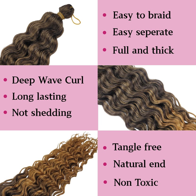 Product Specifications: 4 packs pre stretched braiding hair 26 inches 90g/pack; 1 pack of 24 inch deep wave curls 100g/pack, lightweight and bouncy, basically meeting the needs of full head braiding.