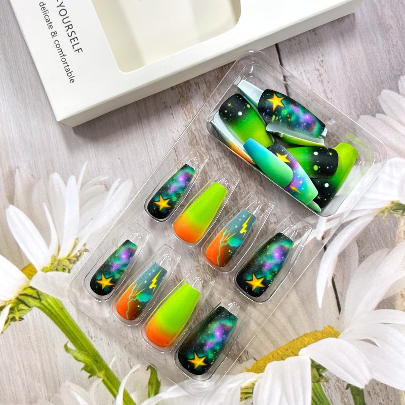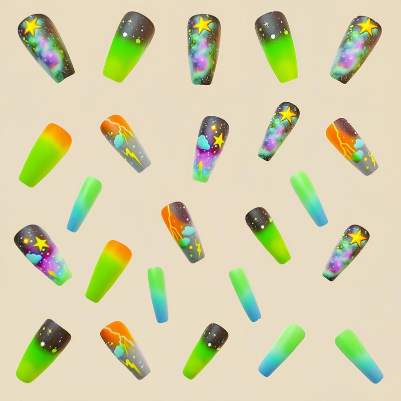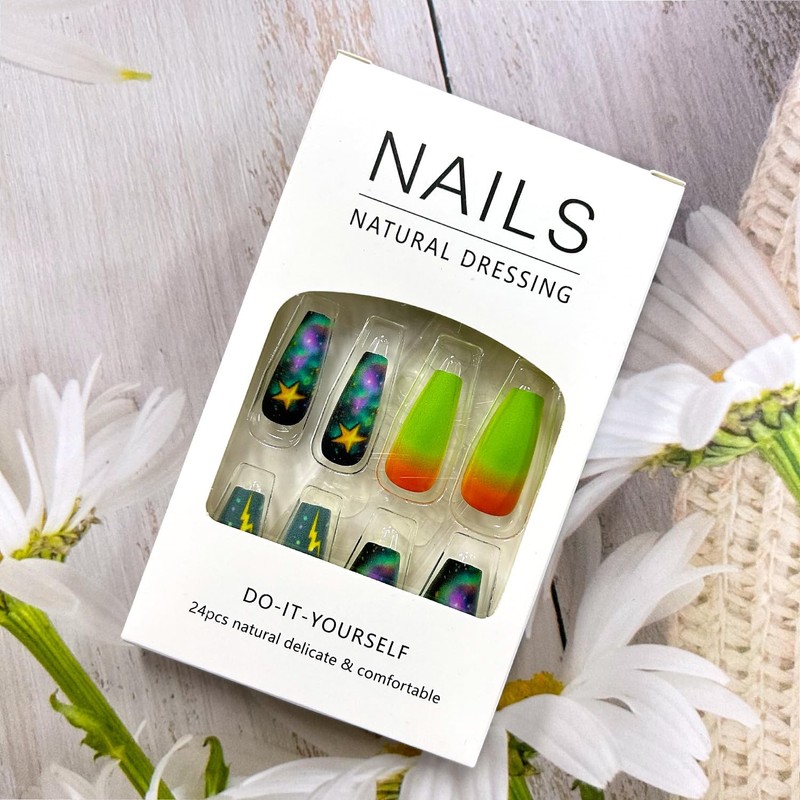 • 【Fake Nails Design】Our artificial nails use stars clouds lightning pattern design, fashion unique design style, give you different other, pretty and comfortable press on nails will give you good mood and add luster to you