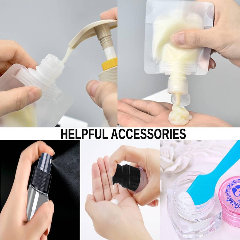 - ✈【Travel Accessories for Women Men】 This functional travel pouches for toiletries meets the needs of on-the-go travel essentials. It features toiletry bottles and jars of various sizes. These include 3 x 30ml Containers Pouches, 3 x 50ml Containers Pouches, 3 x 100ml Containers Pouches, 2 x 25ml Spray Bottle, 1 x Plastic Funnel, 2 x Pipette Stored, 2 x Label Paper, 2 x Cream box, 1 x Mini Spatula.