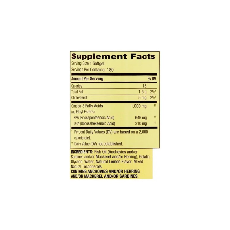 Los geles blandos de Spring Valley Omega-3 ayudan a brindar apoyo general para la salud del corazón, el sistema inmunológico y los huesos. Los geles blandos contienen 1000 miligramos de omega-3, 645 miligramos de EPA y 310 miligramos de DHA. Son una mezcla única de ácidos grasos esenciales que pueden ayudar con la salud y la belleza diarias. El consumo de ácidos grasos omega-3 puede reducir el riesgo de enfermedad coronaria. Gracias a los sabores naturales de limón, facilitamos la obtención de ácidos grasos. Los ácidos grasos omega-3 que se encuentran en el aceite de pescado pueden desempeñar un papel importante en la función y el desarrollo del cerebro. Adquiera hoy los geles blandos Omega-3 de Spring Valley.