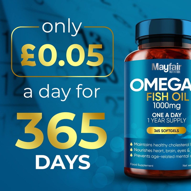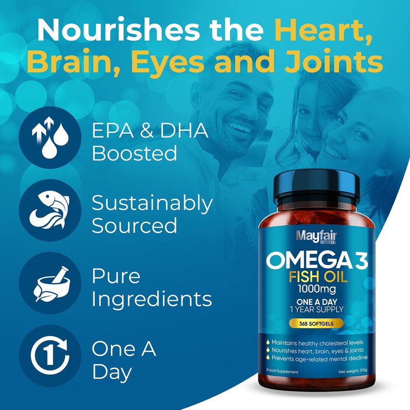 Omega 3 1000mg Capsules - 365 Fish Oil Tablets with EPA & DHA - One a Day - Supports Heart, Vision, & Brain Health - 1 Year Supply - Made in UK