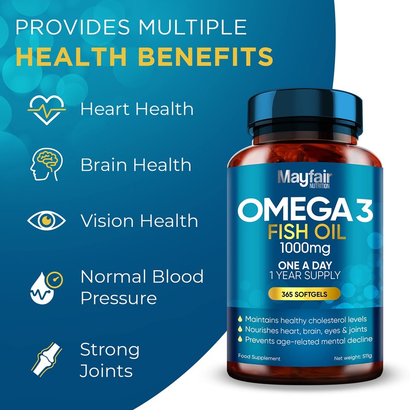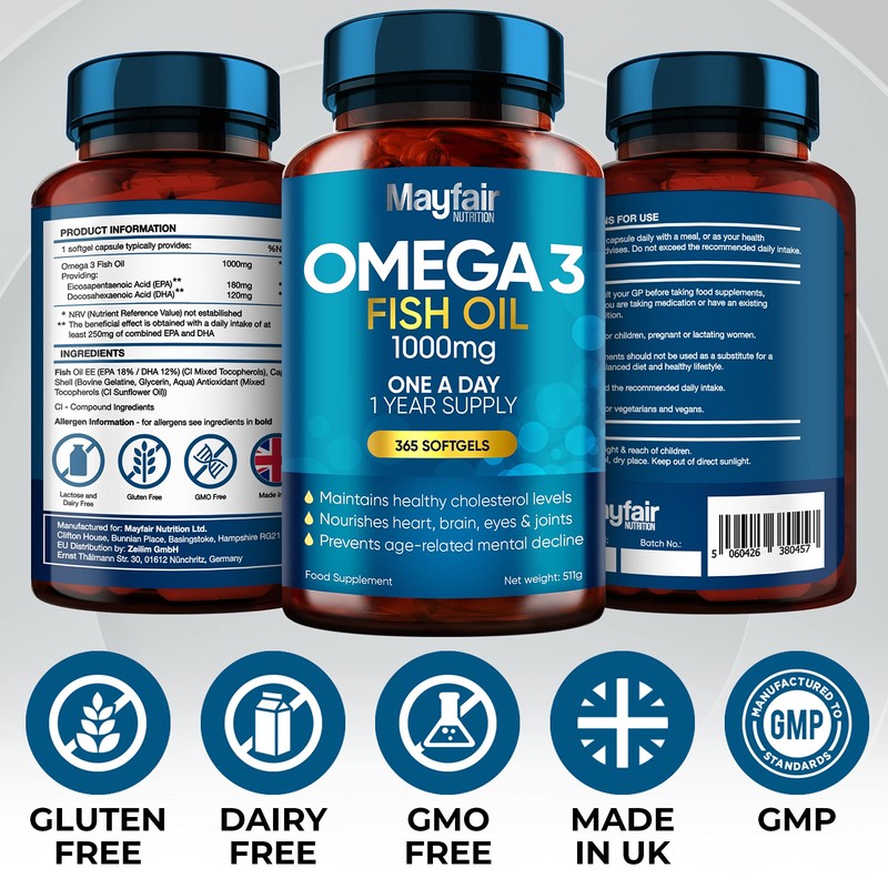 - Why Our Omega 3? - Our fish oil capsules contain a perfect blend of essential omega 3 fatty acids providing 180mg EPA and 120mg DHA per daily serving, which contributes to the maintenance of normal vision, brain and heart function, and normal blood pressure.