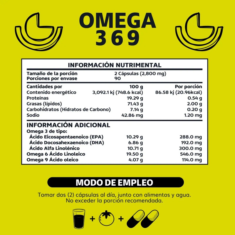 BALANCE ÓPTIMO DE OMEGAS EN UNA SOLA FÓRMULA Omega 3-6-9 Premium Concentrado es un suplemento de alta calidad que combina en proporciones ideales tres tipos fundamentales de ácidos grasos esenciales: Omega-3, Omega-6 y Omega-9. Esta fórmula avanzada ofrece un perfil completo de lípidos saludables, esenciales para complementar una dieta equilibrada. COMPOSICIÓN CLAVE POR PORCIÓN - 480 mg de EPA y DHA (Omega-3): Provenientes de fuentes marinas purificadas, estos ácidos grasos son altamente biodisponibles y reconocidos por su pureza. - 300 mg de Ácido Alfa-Linolénico (ALA - Omega-3): De origen vegetal, ideal para quienes buscan una fuente complementaria de Omega-3. - 546 mg de Omega-6: Equilibrado para mantener una proporción saludable con los demás ácidos grasos. - Omega-9 (ácido oleico): Proveniente de aceites vegetales seleccionados, aporta un perfil graso completo. FÓRMULA PREMIUM Y CONCENTRADA Cada cápsula cuenta con aceites purificados y estandarizados para asegurar alta concentración y calidad.