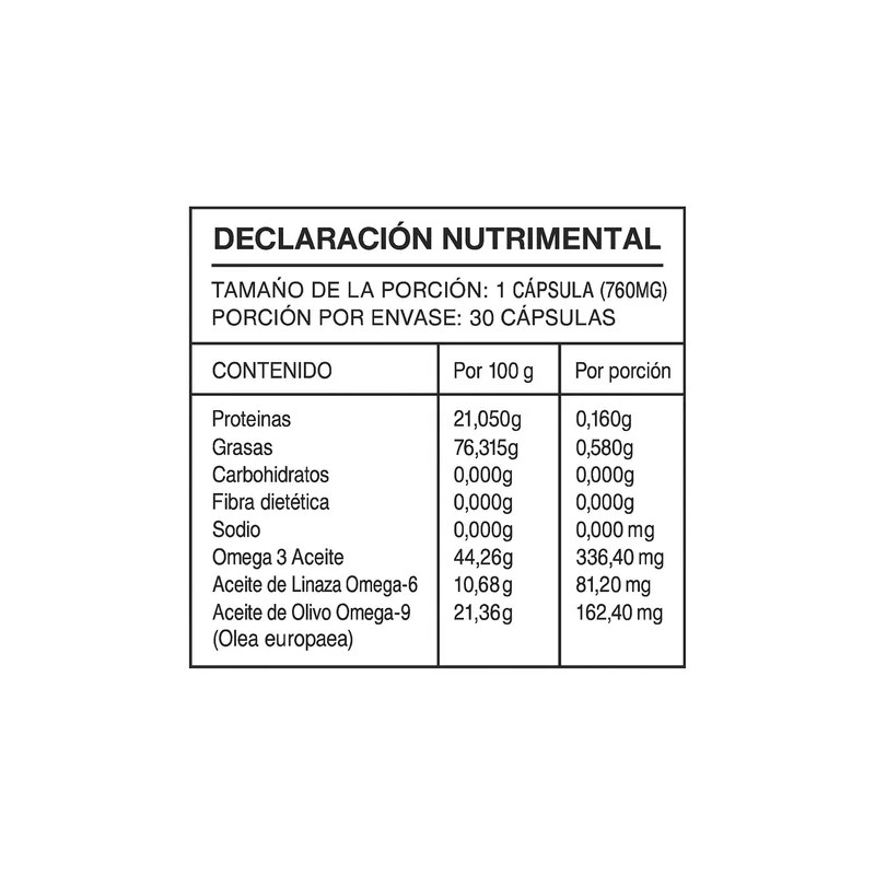 Ingredientes activos: Omegas 3 (ALA, EPA, DHA), Omega 6, Omega 9, Vitamina E (α-Tocoferol)
