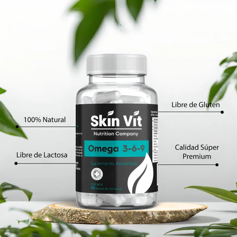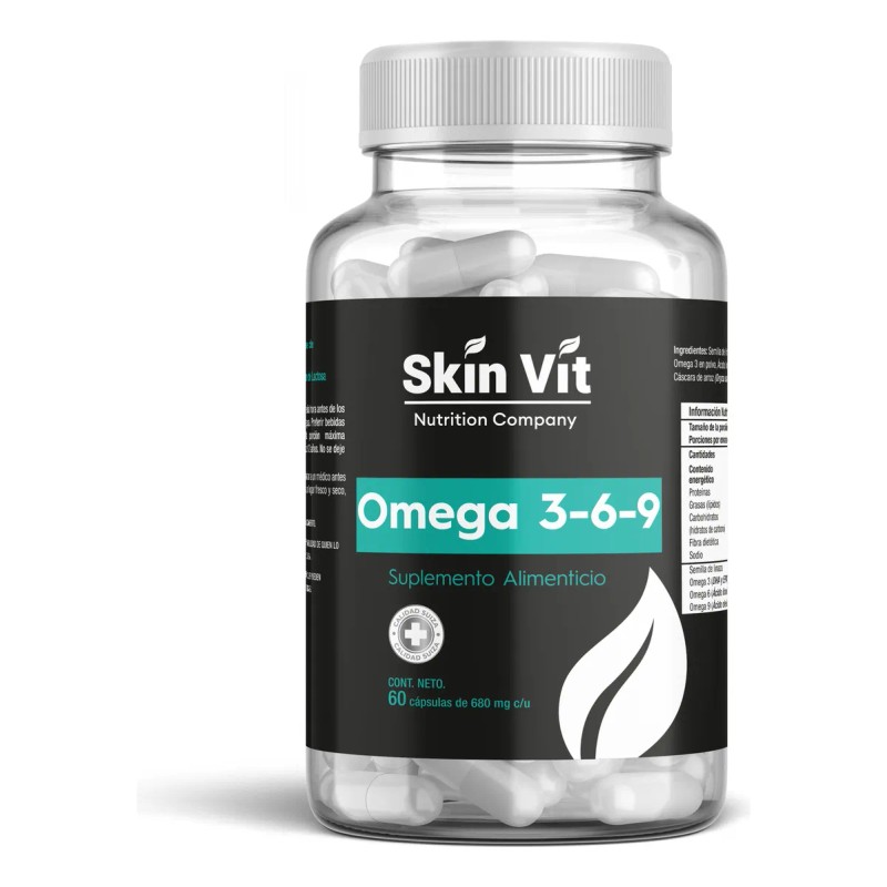 Skin Vit Nutrition Company presenta su producto estrella: Omega 3 6 9 - Skin Vit de 60 cápsulas súper premium. Este suplemento alimenticio se distingue por sus ingredientes de primera calidad, importados y cuidadosamente seleccionados. Contiene omega 3 ácido alfa linolénico, omega 6 ácido linoleico y omega 9 ácido oleico, todos esenciales para el bienestar del organismo. Cada porción aporta 680mg de estos valiosos nutrientes.