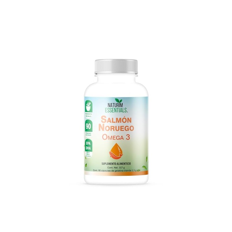 Descubre el poder del océano en cada cápsula de nuestro Suplemento Alimenticio Salmón Noruego Omega 3 de Naturim Essentials. Cuidadosamente formulado para ofrecerte los máximos beneficios de los ácidos grasos esenciales EPA (300 mg) y DHA (200 mg), este suplemento es un tesoro de salud encapsulado. Cada frasco contiene 90 cápsulas de 1.3 g, garantizando un suministro generoso para tu bienestar continuo. Nuestro Suplemento Alimenticio Salmón Noruego Omega 3 se deriva exclusivamente de salmón noruego de aguas profundas, garantizando su pureza y calidad superiores. Cada cápsula ha sido cuidadosamente elaborada para ofrecerte la máxima potencia y efectividad sin comprometer la pureza del producto. En Naturim Essentials, creemos en el poder de la naturaleza para nutrir y fortalecer el cuerpo. INGREDIENTES: Aceite de Salmón De la corteza: Gelatina, glicerina y agua purificada MODO DE USO: Tomar 1 cápsula 3 veces al día. Preferentemente con los alimentos NO EXCEDER LA PORCIÓN MÁXIMA RECOMENDADA NO CONSUMIR POR MENORES DE 12 AÑOS. CONTIENE DERIVADOS DE PESCADO, ESTE PRODUCTO SE ENVASA EN EQUIPOS QUE PROCESAN DERIVADOS DE SOYA, LECHE Y CRUSTÁCEOS. MANTÉNGASE EN UN LUGAR FRESCO Y SECO. NO SE EXPONGA AL SOL. NO SE DEJE AL ALCANCE DE LOS NIÑOS. "ESTE PRODUCTO NO ES UN MEDICAMENTO". "EL CONSUMO DE ESTE PRODUCTO ES RESPONSABILIDAD DE QUIEN LO RECOMIENDA Y DE QUIEN LO USA". "NO CONSUMIR POR PERSONAS CON PROBLEMAS DE COAGULACIÓN" IMPORTANTE: NO CONSUMIR EN CASO DE QUE EL SELLO DE LA TAPA HAYA SIDO VIOLADO.