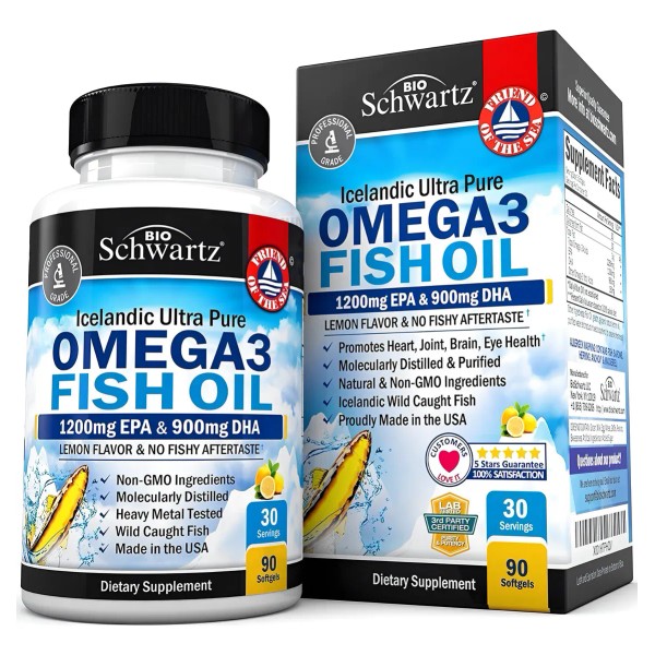 Disfruta de los beneficios óptimos para la salud con el aceite de pescado Omega-3 BioSchwartz, uno de los suplementos de aceite de pescado concentrado más alto disponible, sin el regusto de pescado ni desagradables eructos de pescado.