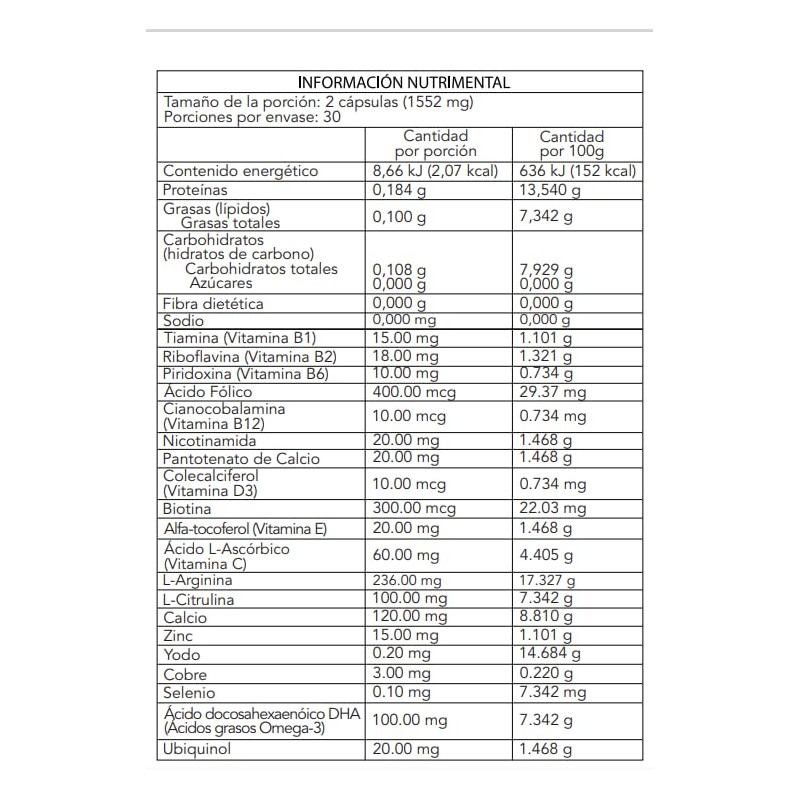 - Cápsulas a base de Ácidos Grasos Omega-3, L- Citrulina, L-Arginina, Ubiquinol, Vitaminas y Minerales.