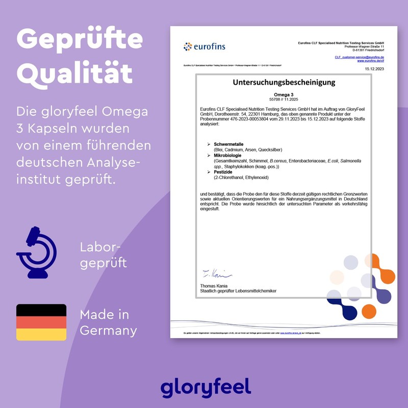 - Made in Germany and independently laboratory tested – manufactured in Germany under the highest quality standards and strictest quality controls, each Gloryfeel product is subject to continuous tests of accredited independent German testing laboratories certified according to DIN EN ISO/IEC 17025. ▶️ Certificate of analysis: see product images. We have our Omega 3 capsules tested for loads such as heavy metals, salmonella and mould.