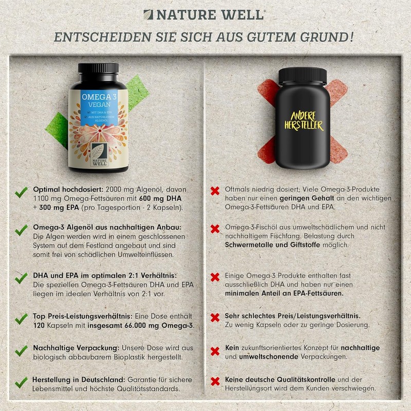 - Alternative to fish oil: Omega-3 fish oil is a by-product of the global fish industry and therefore also contributes to the overfishing of the world's oceans. The NatureWell Omega-3 capsules provide the body with omega-3 just like fish oil capsules, but are 100% vegan and are therefore a sustainable alternative to fish oil capsules.