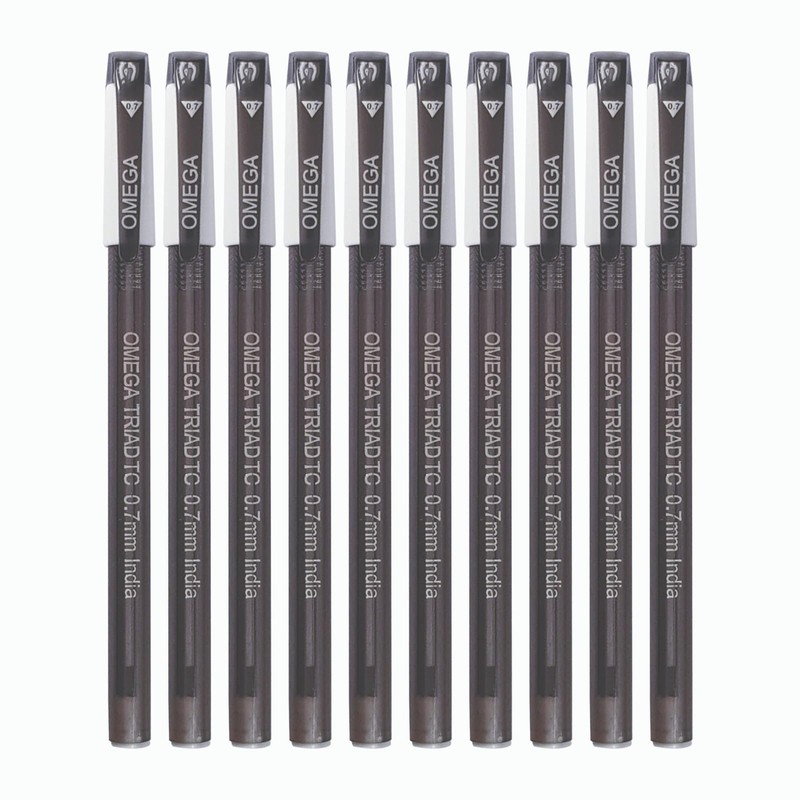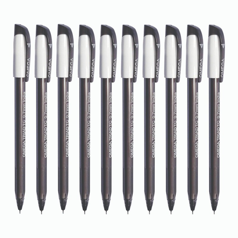 OMEGA Triad-TC Ballpoint Pens, BLACK, Fine Point (0.7 mm), Pack of 10, Smooth Ball Pens, Triangular Inbuilt Grip, School Office Home Everyday Use Pens