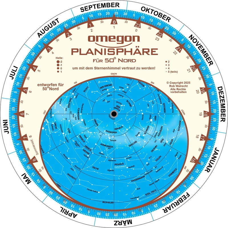 Don't guess what stars might be above you. The Big Cart, the Sagittarius, the Summer Triangle: With the Omegon rotating star map you have the knowledge of the constellations and where to find them in your pocket. This map contains all the constellations of the northern sky plus lots of DeepSky objects for your observations. So that you know yourself in the sky at any time and season as if you had always known.