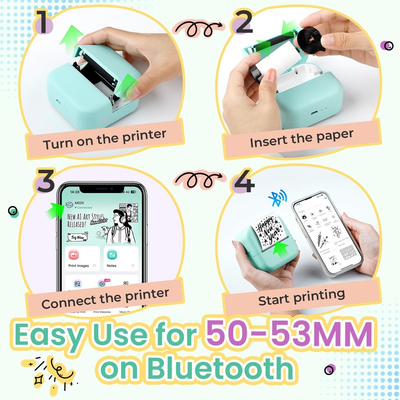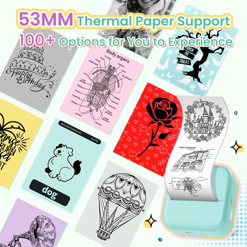 - Flexible Printing - Our inkless sticker photo printer designed for 53MM thermal paper and supports over 50 types of thermal paper for black and white. Not just for standard white paper, our mini thermal printer also handles colored, transparent, and semi-transparent papers with ease. Moreover, this mini pocket printer allows you to create blue-patterned labels using specialty thermal paper