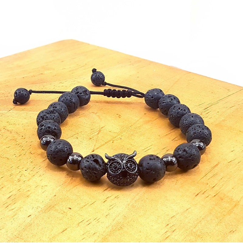 Omky Pulsera Búho |Brazalete Ajustable Piedra Volcánica | Regalo Hombre Mujer | (Negro)