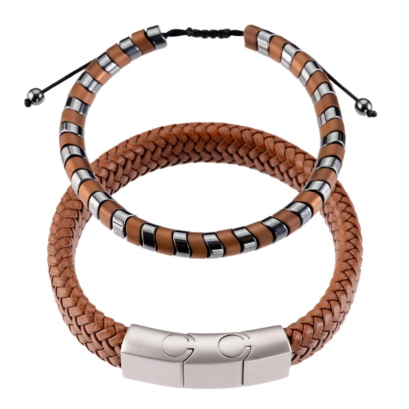 - GRAN CALIDAD El set incluye dos pulseras 1) Pulsera ajustable con cuentas de hematita de 6 mm en colores plateado y café, se ajusta desde 16cm a 24cm con hilo chino de calidad, resistente y duradero. 2) Pulsera de cuero trenzado en color café con cierre magnético de acero inoxidable, diámetro 23 cm.