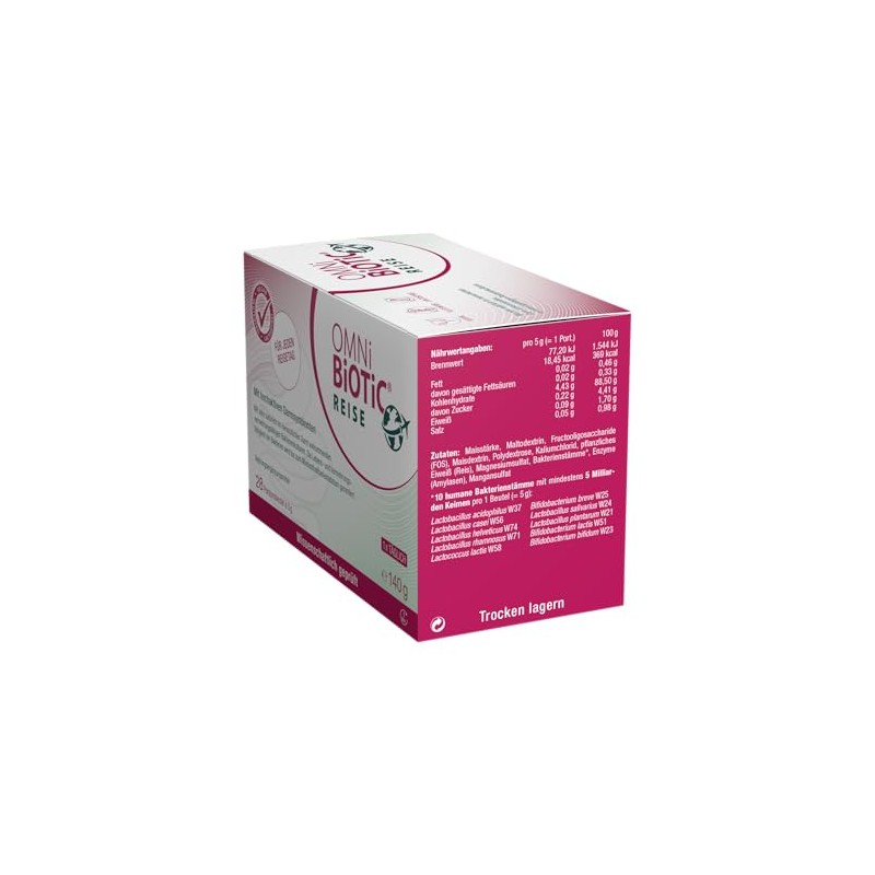 ProduktbeschreibungDie zehn speziell ausgew?hlten Bakterienst?mme in OMNi BiOTiC REISE sorgen mit der hohen Anzahl von fnf Milliarden hochaktiven Darmbakterien pro Sachet dafr, dass Sie Ihre Reise genie?en k?nnen. Eine Besonderheit von OMNi BiOTiC REISE ist die Matrix, in welche die Bakterien eingebettet sind: Enzyme und Ballaststoffe kurbeln die Aktivit?t der Bakterien massiv an und garantieren deren berleben in der Umgebung von Magen und Zw?lffingerdarm C ganz ohne chemische Hilfsmittel wie Kapsel oder Lackierungen.Inhaltsstoffe / ZutatenMaisst?rke, Maltodextrin, Fructooligosaccharide (FOS), Maisdextrin, Polydextrose, Kaliumchlorid, pflanzliches Eiwei? (Reis), Magnesiumsulfat, Bakterienst?mme*, Enzyme (Amylasen), Mangansulfat. *10 humane Bakterienst?mme mit mindestens 5 Milliarden Keimen pro 1 Portion (= 5 g): Lactobacillus acidophilus W37, Lactobacillus casei W56, Lactobacillus helveticus W74, Lactobacillus rhamnosus W71, Lactococcus lactis W58, Bifidobacterium breve W25, Lactobacillus salivarius W24, Lactobacillus plantarum W62, Bifidobacterium lactis W51, Bifidobacterium bifidum W23.GebrauchsanweisungAm besten beginnen Sie schon einige Tage vor der Reise, t?glich morgens vor dem Frhstck 1 Beutel OMNi-BiOTiC REISE (= 5 g) einzunehmen. Das Pulver in Wasser, Milch, Tee oder Joghurt einrhren, mindestens 1 Minute Aktivierungszeit abwarten, nochmals umrhren und dann trinken. Diese Vorgangsweise w?hrend der gesamten Reise fortsetzen. Wenn Sie an einer Fructoseintoleranz leiden, sollten Sie die Aktivierungszeit auf mindestens 30 Minuten verl?ngern. In dieser Zeit verstoffwechseln die Bakterien die gesamten Fructooligosaccharide. Es gelangt somit keine Fructose in den Darm.WarnhinweiseDem Produkt wurde keinerlei tierisches Eiwei?, Gluten, Hefe oder Lactose zugefgt und es ist fr Diabetiker und Milchallergiker geeignet. Nahrungserg?nzungsmittel sind kein Ersatz fr abwechslungsreiche und ausgewogene Ern?hrung. Achten Sie auf eine gesunde Lebensweise. Empfohlene Tagesdosis nicht berschreiten. Au?erhalb der Reichweite von kleinen Kindern aufbewahren.Anschrift Hersteller/Importeur?Institut Allergosan Pharmazeutische Produkte, Gmeinstra?e 13, 8055 Graz, Austria