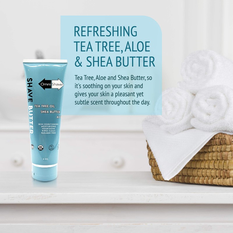 - REFRESHING TEA TREE, ALOE & SHEA BUTTER: OmniShaver natural shave cream contains Tea Tree, Aloe, and Shea Butter for a soothing effect and a subtle scent. Keeps skin looking and feeling fresh anytime.