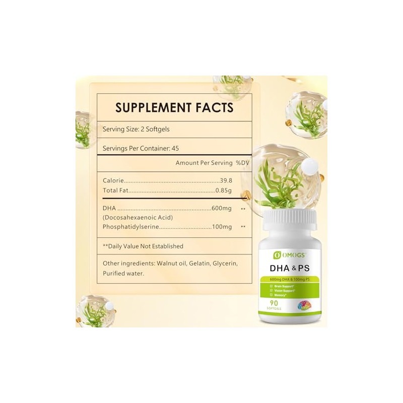 OMOGS Algae Dha - Cpsulas Blandas De Omega-3 Dha De 600 Mg, Con Fosfatidilserina Y Aceite De Nuez, Favorece El Funcionamiento Saludable Del Cerebro,