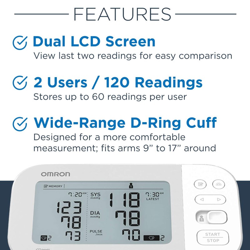 - The OMRON Gold monitor features a dual-display, last reading comparison, and easy screen navigation. For added convenience, a handy storage case is included.