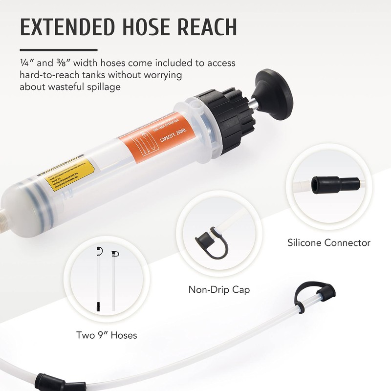 - WIDE APPLICATION: Our fluid extractor comes with 1/4" and 3/8" extension tubes each 9 inches long to get at even hard-to-reach locations for extracting and changing transmission fluid, power steering fluid, gear oil, and brake fluid on ATVs, boats, cars, trucks, and other vehicles
