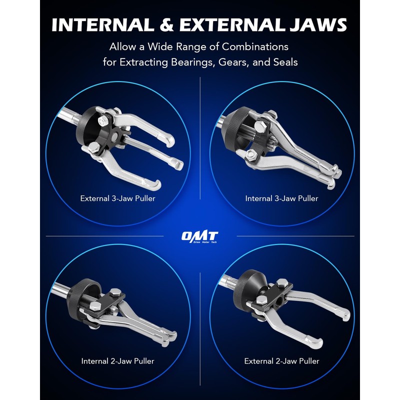 • INTERNAL & EXTERNAL JAWS: Includes 2-jaw and 3-jaw pullers for internal and external work to provide a variety of combinations to pull bearing, gears, and seals. 2 and 3-way cross blocks and cone-type puller provide the perfect jaw configuration for most jobs.