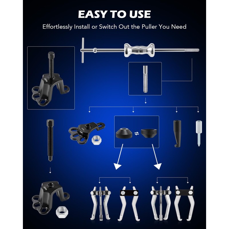 • VERSATILE PULLER SET: The Orion Motor Tech 9-Way Slide Hammer Puller Set with 4 lb slide hammer is ideal for a variety of pulling applications, including flange-type rear axles, most front-wheel-drive hubs, pulling dents, and other press-fit parts (bearings, bushings, gears, pulleys, etc.).