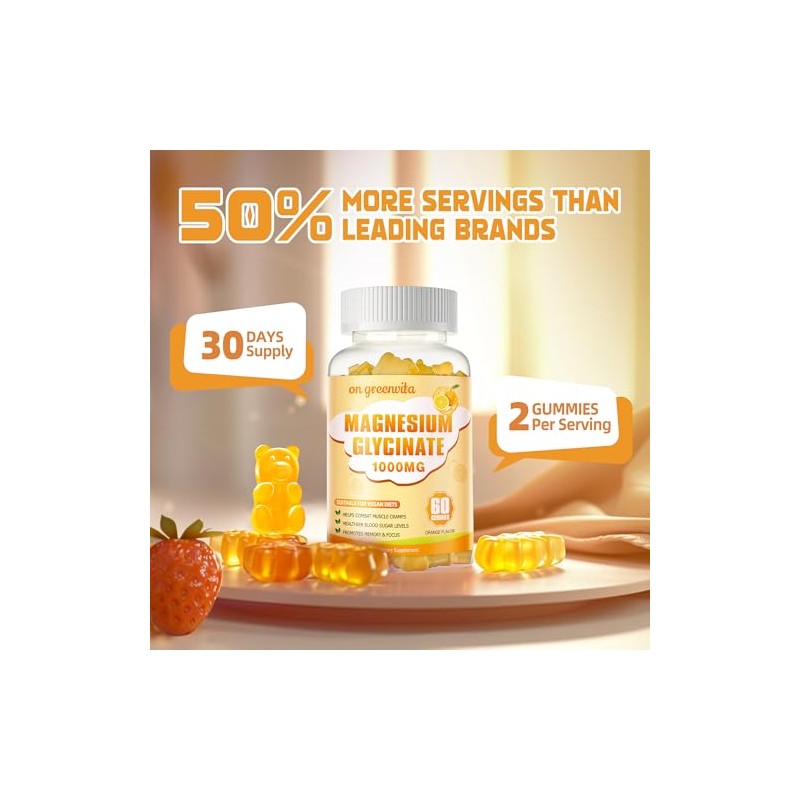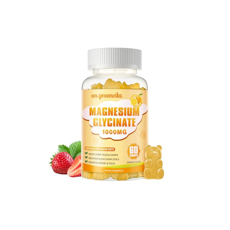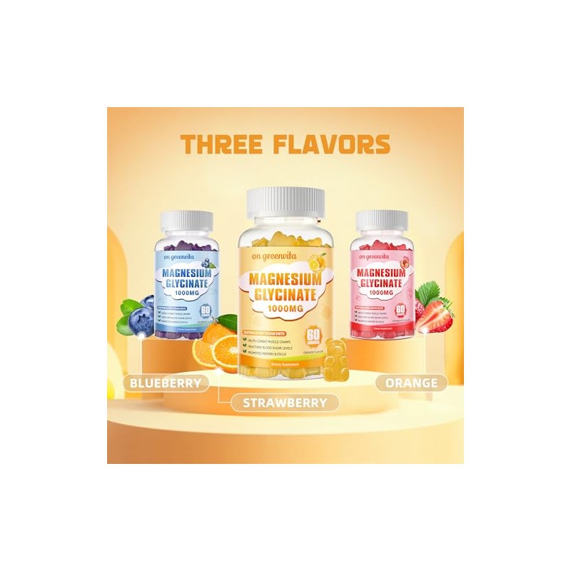 on greenvita Magnesium Glycinate Gummies 1000mg - Sugar Free Magnesium Potassium Supplement with Vitamin D, B6, CoQ10 for Calm Mood & Sleep Support - 60 Orange Gummies