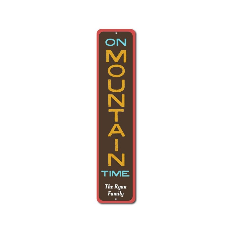 On Mountain Time Sign, Family Last Name Decor, Custom Skier Hiker Outdoors Lover Man Cave Aluminum Sign - 6" x 24"