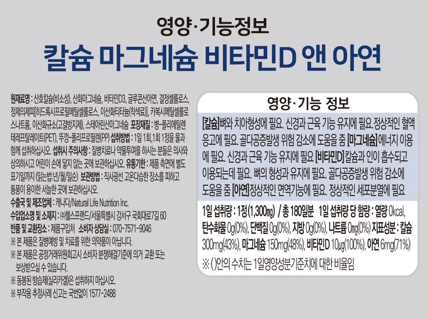 - 제품명: 칼슘 마그네슘 비타민D 앤 아연